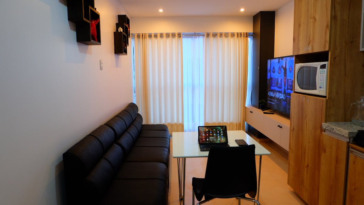 Es un espacio moderno y acogedor, en un edificio destinado a apartamentos Airbnb, ubicado en el corazón de la manzana lo que lo hace tranquilo y seguro, pero a la vez céntrico cuenta con un patio, y dos terrazas con vista panorámica de la ciudad y las montañas, con espacios generosos como el área de dormitorio con closet, una cocineta bien equipada con una mesa de comedor , un Smart tv de 50 pulgadas, un baño moderno con buena iluminación y ventilación, que harán tu estadía grata y placentera
