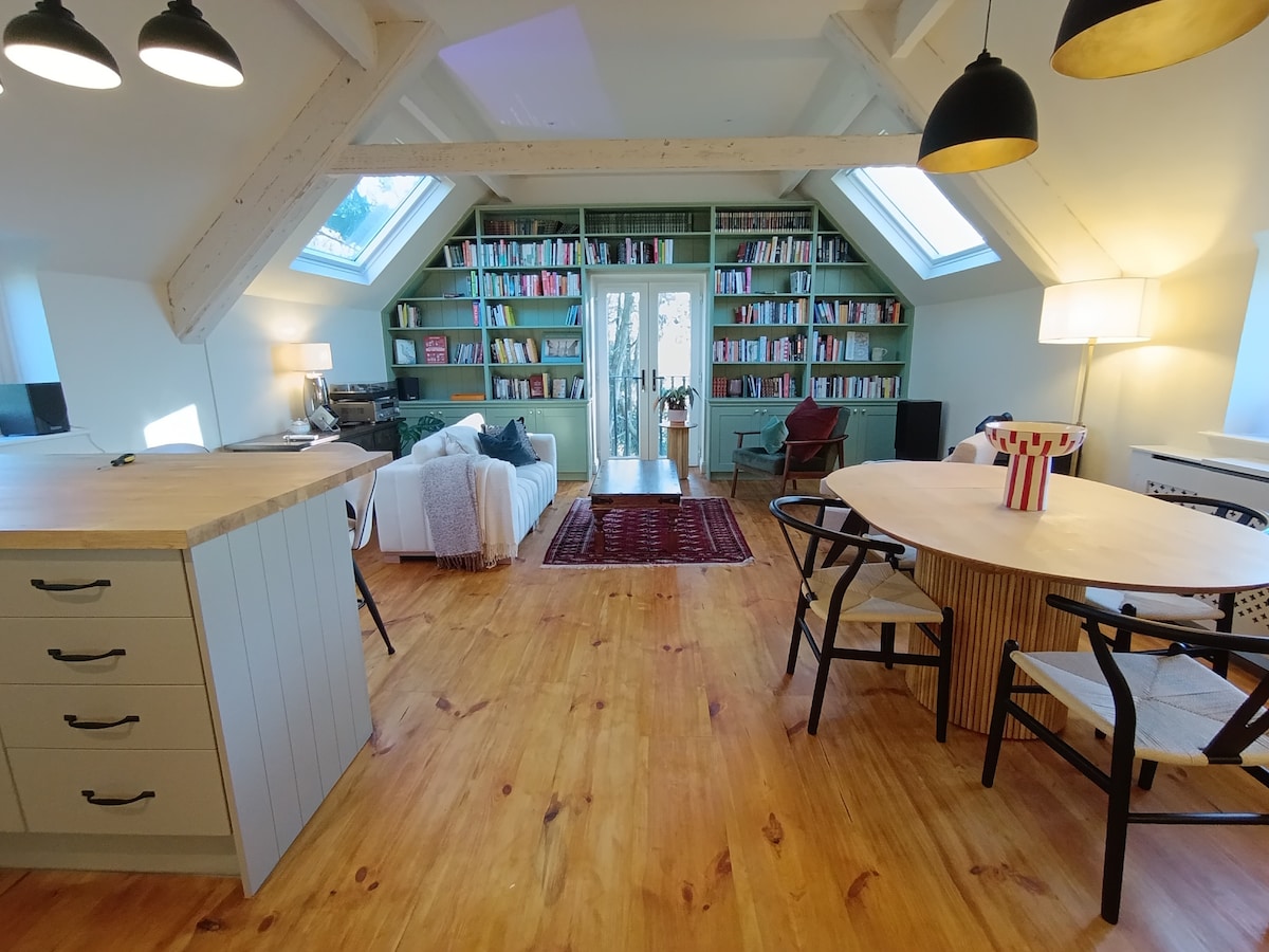 The Library Loft ialah percutian persendirian yang berorientasikan reka bentuk yang terletak di atas kolam renang dalaman yang tenang, dikelilingi oleh kawasan desa Oxfordshire yang terbuka. Dipenuhi dengan buku, rekod dan projektor gaya gaya pawagam, ia sesuai untuk pasangan yang mencari kemewahan yang tenang dan masa yang memulihkan. Dengan ruang untuk menulis, membaca dan berfikir tanpa gangguan, ia adalah syurga untuk golongan kreatif. Serba lengkap, terpencil dan tenang - tempat untuk berehat sepenuhnya. Terletak di dalam tanah persendirian; perjalanan kaki ke kampung yang indah hanya beberapa minit memandu.