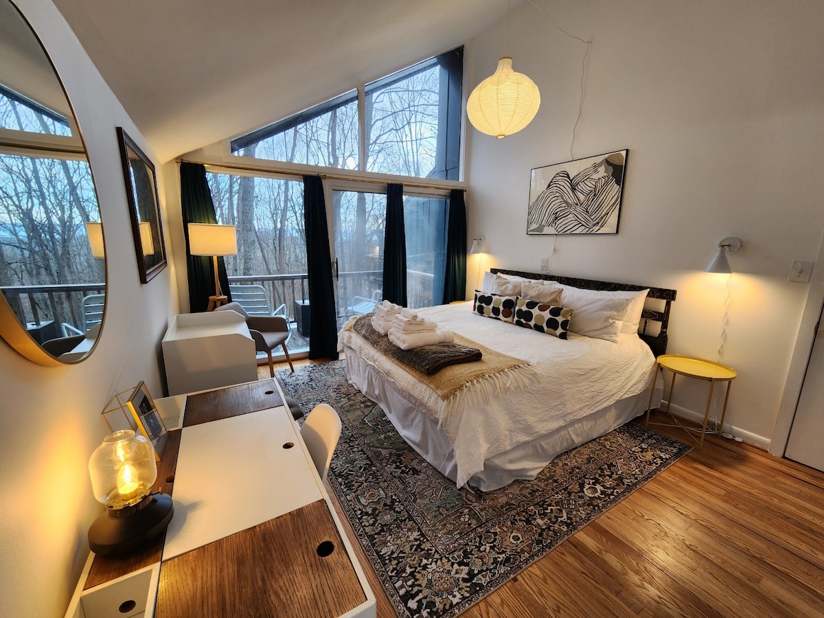 Percutian yang unik dan luas untuk pasangan, keluarga kecil, atau pengembara solo. Bilik hebat 30 kaki, dinding tingkap menghadap dek besar, lantai oak TAB MANDI PANAS BARU dalam suasana peribadi. Bilik tidur king dengan bilik mandi en suite; loteng mempunyai katil berkembar. Moden dengan sentuhan mcm & vintaj mencipta percutian ajaib untuk anda di puncak pokok. Di atas 2 ekar. Mendaki ke puncak Gunung Cacapon dari pintu belakang. Pemanduan pantas (3 minit) ke kolam renang komuniti persendirian/tab mandi air panas/kolam renang TOT (musim panas sahaja). 10 minit ke Berkeley Springs dengan Roman Baths, seni