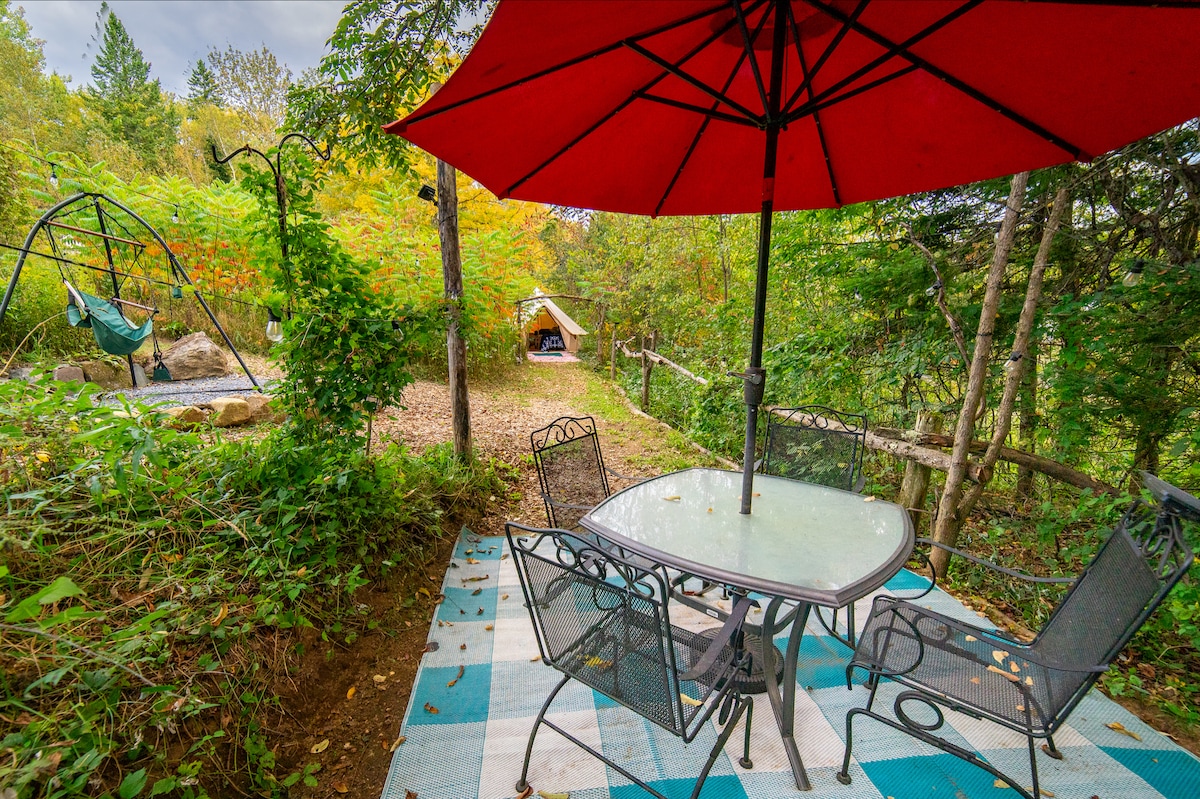 Khemah loceng kanvas yang cantik dalam suasana terpencil, dilengkapi dengan katil busa memori queen yang berpakaian mewah, bantal, meja, pencahayaan, kerusi, set patio luar + buaian rajut. Kopi dan teh dengan krim & gula tersedia sepanjang hari. Kami menyediakan air minuman, penyejuk untuk digunakan, semuanya kecuali pakaian dan makanan anda (kecuali sarapan pagi, kami ada air minuman!) * Dapur Solo untuk kebakaran Glampsite persendirian tersedia untuk disewa pada harga $ 50/malam, semua kayu disediakan. Inventori terhad, mesti menempah, didahulukan, didahul