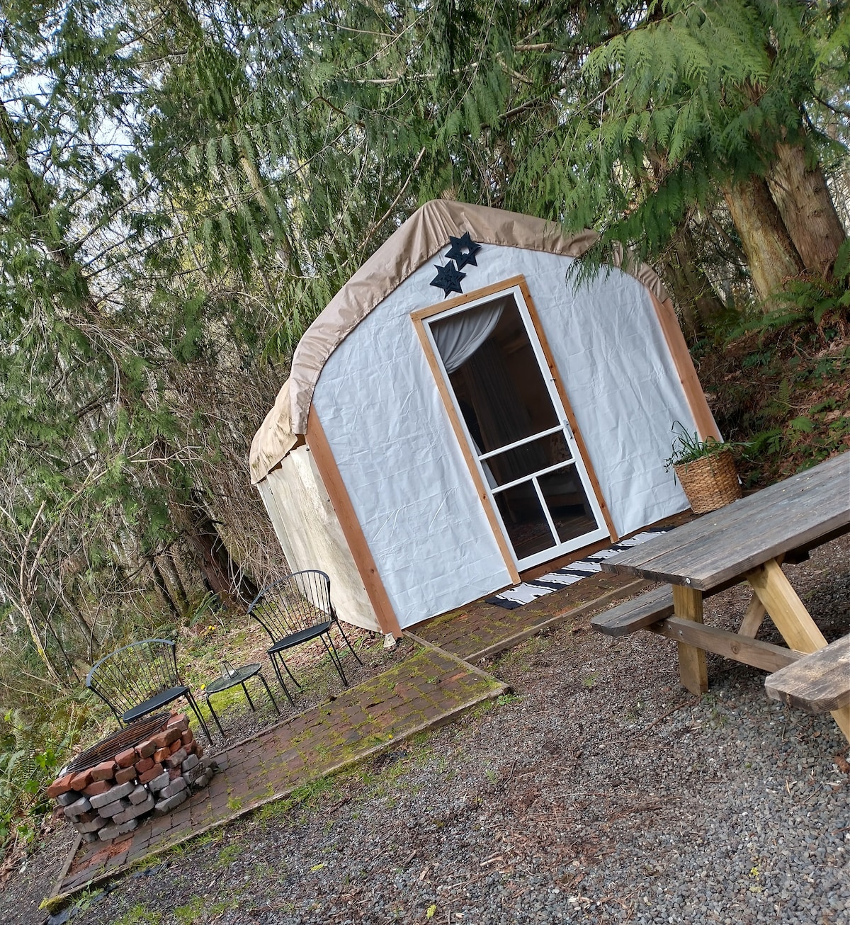 Larikan diri daripada kebisingan dan kesibukan bandar dan tukar dengan penginapan yang santai di khemah kami yang selesa. Di sini anda boleh memanggang makan malam, berehat di tepi perapian, duduk di beranda dan menikmati filem kegemaran anda di projektor. Kemudian anda boleh tertidur sambil mendengar bunyi alam semula jadi dengan api yang berderak untuk memastikan anda hangat. Anda boleh bangun dengan bunyi ayam jantan berkokok sambil anda minum secawan kopi segar sebelum anda memulakan pengembaraan anda meneroka semua yang ditawarkan oleh Semenanjung Olimpik.