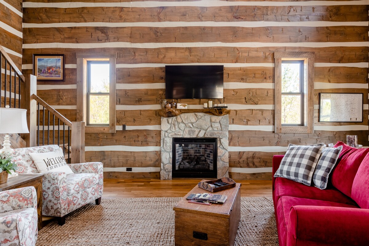 Kayu yang digunakan untuk membina kabin ini berusia lebih 140 tahun dan telah dipindahkan ke sini pada tahun 1973 dari Madison County NC. Kabin ini telah diubahsuai dengan kemudahan dan kemewahan moden. Dapur ini dilengkapi dengan permukaan kaunter granit, peralatan keluli tahan karat, peti sejuk dengan pembuat ais, mesin basuh pinggan mangkuk dan ketuhar. Lantai bilik mandi dan pancuran mandi penuh dilitupi dengan jubin porselin tersuai manakala lantai bilik tidur dan loteng mempunyai lantai oak putih dan ruang tamu, dapur dan lantai makan adalah tiga warna di atas konkrit. Dinding penuh batu mengelilingi pendiangan gas di ruang tamu. Nikmati pemandangan gunung dan padang rumput dari anjung tertutup, ruang tamu dan bilik tidur utama. Menghadap dapur adalah loteng dengan sofa kulit Itali yang besar, kerusi kulit "S" dan Smart tv. Ruang tamu tingkat utama dan kedua-dua bilik tidur juga mempunyai televisyen.