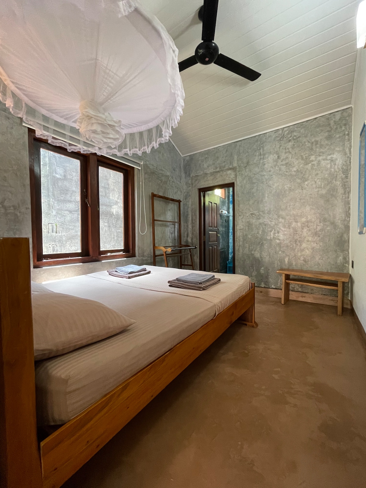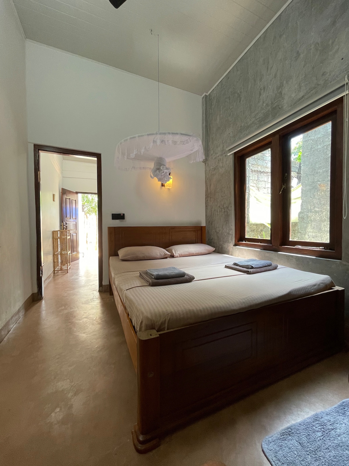 Beautiful private king room in jungle villa. The house has 3 rooms this listing is for 1 room with 1 king bed. Your room has AC, private bathroom and hot water. Beach is a 20-min walk or 3-min drive, and 5 mins to the best surf spots in the south. Enjoy coffee on the daybed, watch monkeys, and shower outside after the beach. SLT SIM works amazing 30-40mbps for remote work Outdoor kitchen and BBQ for fresh fish. Our neighbours cook amazing Sri Lankan meals and deliver to the house.