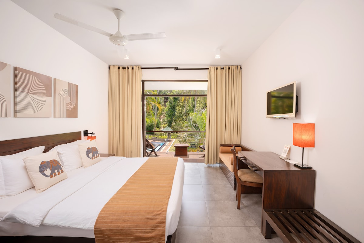 Stay at Hello Mirissa, where contemporary design meets tropical calm. This A/C-equipped luxury boutique room includes a king-size bed, an attached bathroom with a walk-in shower, and a private outdoor dining area perfect for quiet meals. Perfect for couples or business travellers looking for serenity near popular attractions such as Mirissa Beach and Weligama’s Kai Beach Club. The room is furnished with essential amenities for a comfortable retreat.