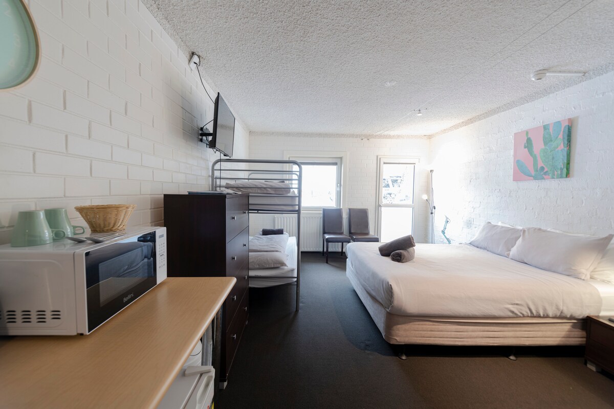 Bilik gaya hotel termasuk peti sejuk mini, ketuhar gelombang mikro & kemudahan membuat teh/kopi Bilik tidur - 1 x Katil Queen dan 1 x Set Bunks Tiada makanan termasuk dalam mana-mana penginapan kami Akses kepada bangunan & apartmen adalah melalui banyak tangga.