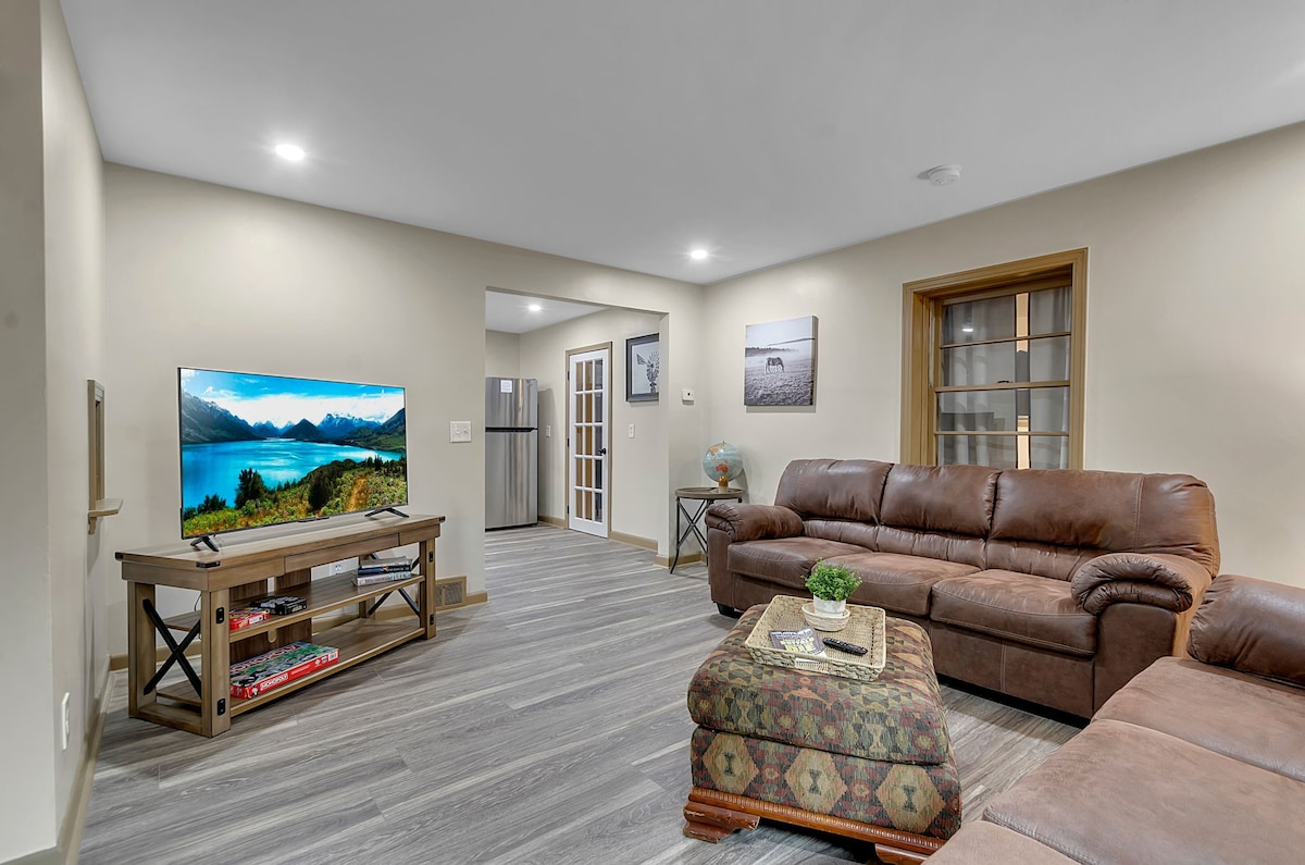 Bring the whole family to this great place with lots of room for fun inside and outdoors. No worries about cleaning and chores enjoy your stay. You will have a nice living area with two sofas, a fluffy rug, and a 70" smart tv. The main level has a full kitchen with all the cooking pots and pans and a dining area. There is a full bath and bedroom on the main level. The upper level has a dedicated work table, one queen bed, and a master bed with a queen bed and bath.