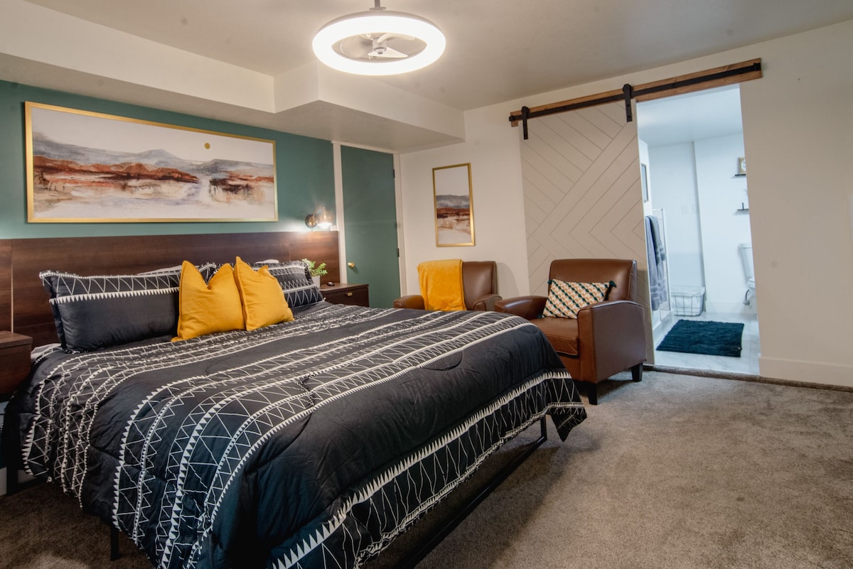Bawa seluruh keluarga ke tempat yang hebat ini dengan banyak ruang untuk berseronok! Seluruh suite bawah tanah dengan garaj kereta tunggal. Bilik teater untuk malam-malam yang letih mengembara dan rasa seperti bermain permainan atau menonton filem. Katil Queen dan katil futon busa memori. Bar basah dengan ketuhar gelombang mikro, penggorengan udara, peti sejuk mini, pembuat kopi, wifi percuma, Mesin basuh pengering, pendiangan. Nikmati ruang bawah tanah unik ini yang direka untuk berehat dan berseronok! 900 kaki persegi semuanya untuk diri anda sendiri! Beberapa minit dari amfiteater Usana, Lapangan Terbang, dan Pusat Bandar SLC