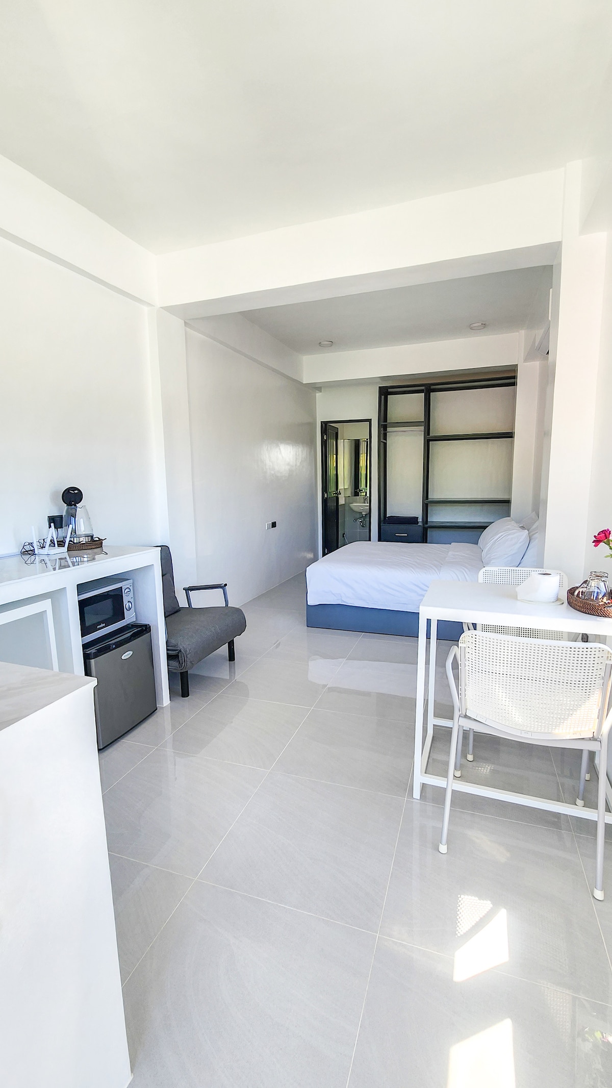 Ini adalah penginapan yang bersih sesuai untuk dua orang. Ia terletak 7 minit berjalan kaki dari Dmall dan 1 minit berjalan kaki dari Pantai Bulabog. Anda boleh menggunakan bumbung dengan bebas, dan kerana ia adalah resort menyelam, kami menawarkan sewaan peralatan snorkeling percuma jika anda mahu.