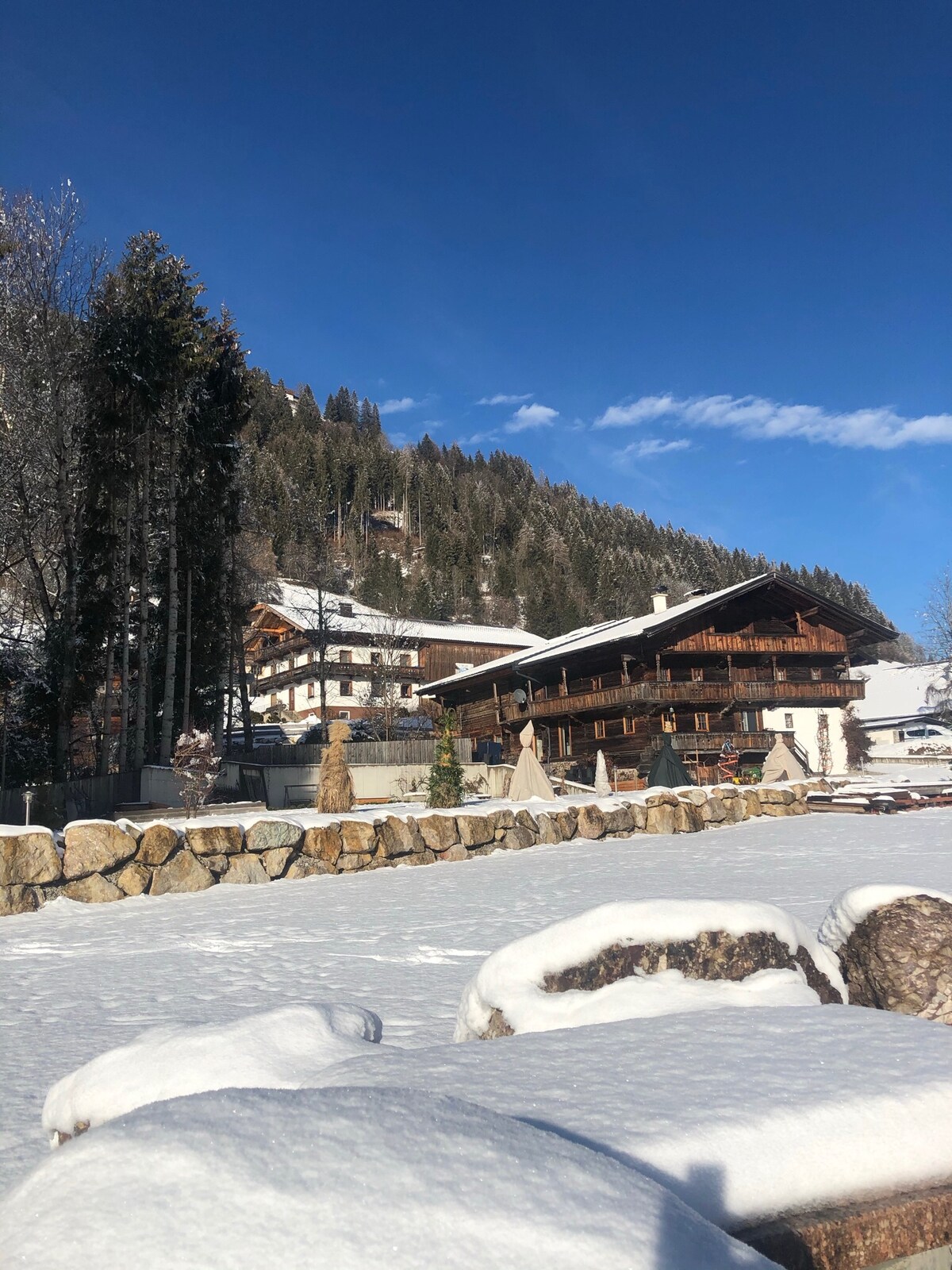 Apartmen berperabot cantik untuk sehingga 4 orang (3 orang dewasa atau 2 pasangan atau 2 orang dewasa dengan 2 kanak-kanak) dengan pemandangan indah Wilder Kaiser pada ketinggian 1,000 m! Pasangan arkitek dengan 2 kanak-kanak lelaki mengimpikan ruang tamu di pergunungan dan cuba menghirup kehidupan baru ke dalam runtuhan tahun 70-an tanpa kehilangan semangat tahun 70-an.