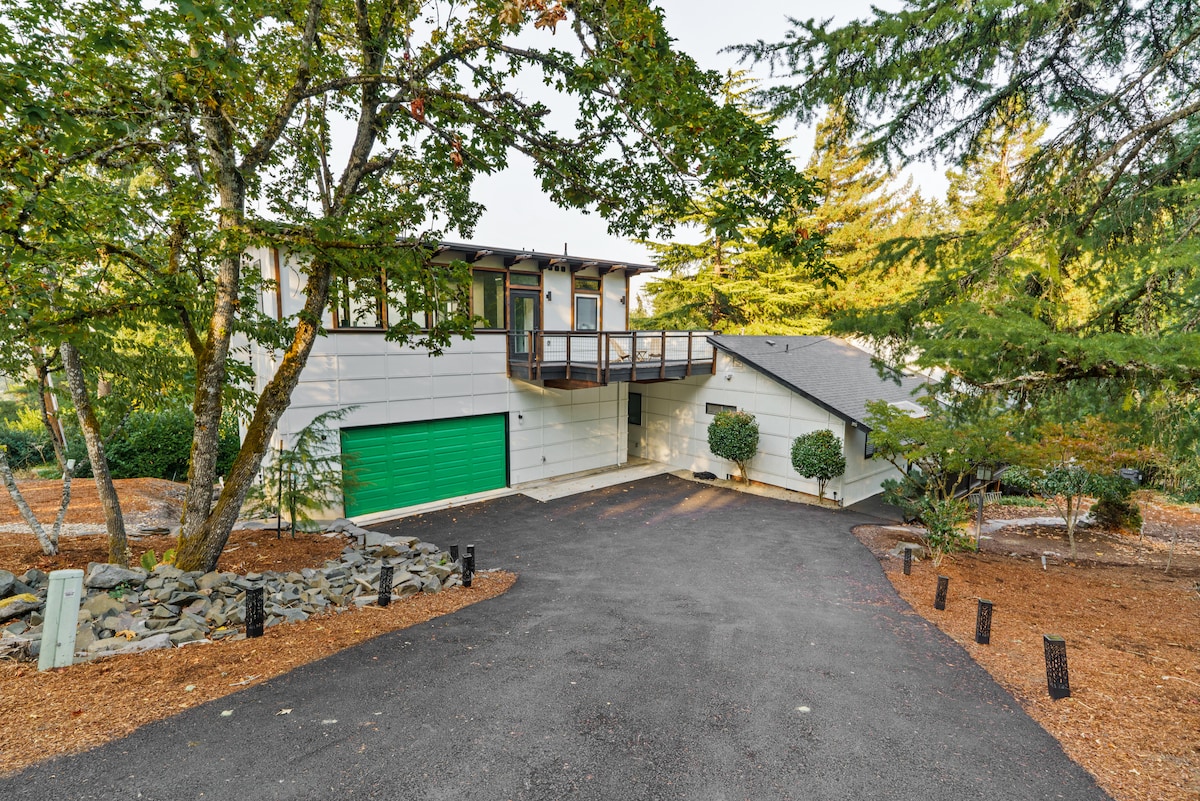 permata hutannya, yang terletak di lot bendera lereng bukit yang subur dan tenang di bukit Eugene Selatan, terletak 1mi dari kedai runcit pilihan, restoran, & kedai kopi Woodfield Station dan Amazon Parkway. Rumah kami adalah impian pejalan kaki, pelari & penunggang basikal, terletak satu batu dari 4 taman popular & merupakan titik pelancaran yang hebat untuk pendakian berbukit dan laluan berbasikal bukit-bukau Barat Daya. U of O & Hayward Field terletak 2.8 batu jauhnya, Stadium Autzen, 3.6 batu, dan hospital McKenzie Riverbend, 6.6 batu.