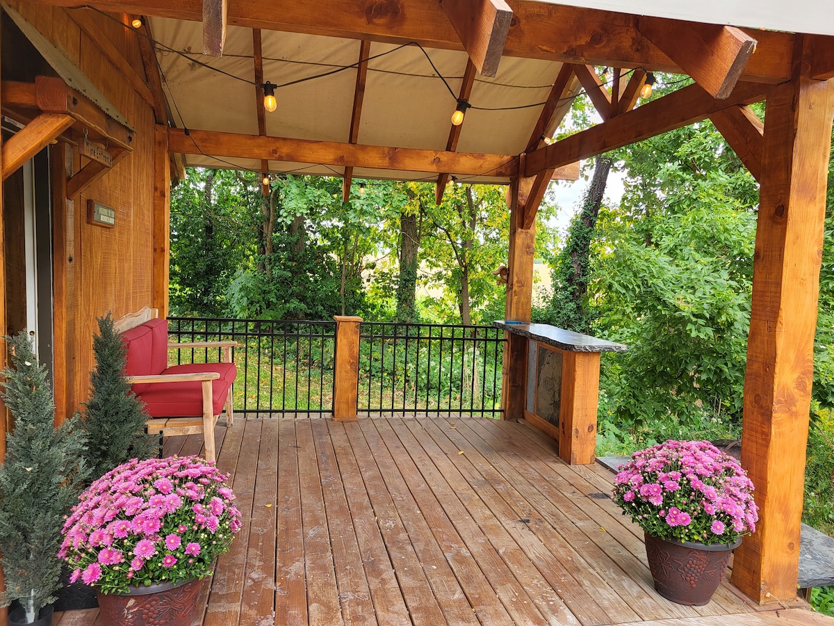 Kotej romantik di bukit Amish Country. Rawat citarasa anda dengan sarapan penuh yang lazat yang dihantar ke pintu anda! Datang dan lepaskan semua kebimbangan anda semasa anda menghirup di kawasan desa yang tenang dan tenang. Dihiasi dengan indah lengkap dengan dapur yang lengkap dan jaccuzzi dua orang yang menghadap pemandangan yang menakjubkan. Nikmati matahari terbenam yang menakjubkan di hadapan api yang hangat di dalam lubang api buatan tangan kami apabila bunyi air yang mengalir dari kolam memenuhi udara.