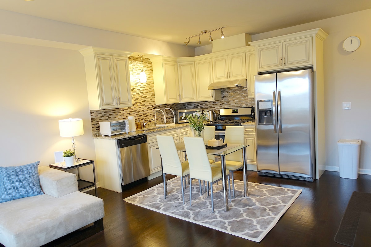 Selamat datang ke rumah bandar 2 bilik tidur, 2 bilik mandi mewah kami yang terletak di tengah-tengah selatan Chicago! Rumah kami sesuai untuk pengembara yang inginkan berhampiran dengan semua tarikan pelancong utama di bandar ini. Nikmati pemandangan bandar yang menakjubkan dari teres atas bumbung kami, di mana anda boleh berehat dan bersantai selepas seharian meneroka. Kompleks selamat kami memastikan keselamatan dan ketenangan fikiran anda sepanjang penginapan anda, sementara tempat letak kereta percuma **Sekatan Terpakai** untuk sesiapa sahaja yang mempunyai kereta.