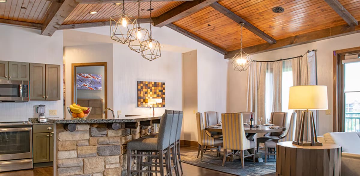 This spacious two-bedroom resort suite measures approximately 1,226 square feet. You will enjoy a king bed in the master bedroom, two double beds in the guest bedroom and one queen sleeper sofa in the living room. Additional amenities include a full kitchen and dining area, balcony, fireplace, two bathrooms, whirlpool tub and washer/dryer. Maximum occupancy is eight. Private sleeping area sleeps six. Rates and availability vary, so contact host to inquire prior to booking