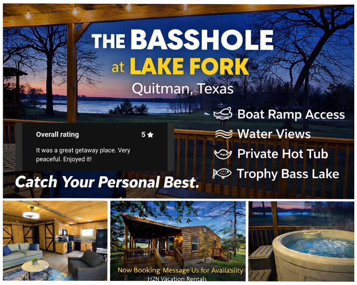 Selesai pada tahun 2016, Sunrise Lodge adalah pengalaman penginapan kelas pertama dengan suasana desa yang damai! Pemandangan tasik yang indah di lokasi yang paling mudah di Lake Fork bersebelahan Lake Fork Marina! Dek besar, gril bbq, lubang api, dapur yang lengkap, & wifi sped yang tinggi serta "pelabuhan bot" tertutup yang menempatkan 2 bot bass yang serba lengkap! Sunrise Lodge menampilkan salah satu adegan ikan terbesar yang ditangkap di Lake Fork serta gunung ikan di seluruh & pelancaran bot persendirian! Penginapan wajib!