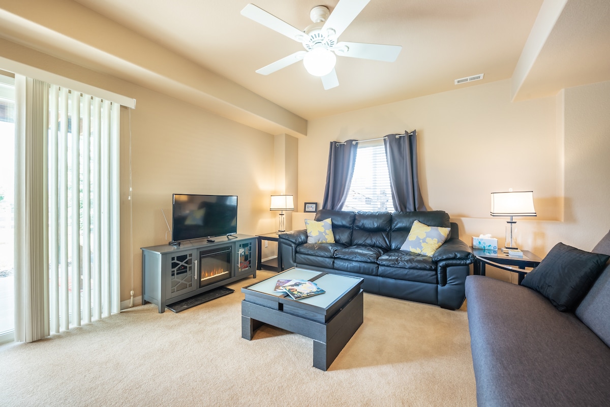 Apartmen bawah tanah yang bersih, selesa dan selesa dengan pemandangan Pikes Peak dan Akademi Tentera Udara yang cantik. Bilik tidur besar dengan katil queen yang selesa, bilik mandi penuh yang dikemas kini baru-baru ini, dapur kecil (harap maklum, tiada ketuhar atau bahagian atas memasak), dan ruang tamu yang besar dengan TV Roku, pendiangan, dan ruang untuk lebih banyak tidur dan melepak. Terletak di kejiranan yang tenang kira-kira 2 batu dari Akademi Tentera Udara, dengan akses lebuh raya yang mudah untuk aktiviti di Denver dan Colorado Springs.