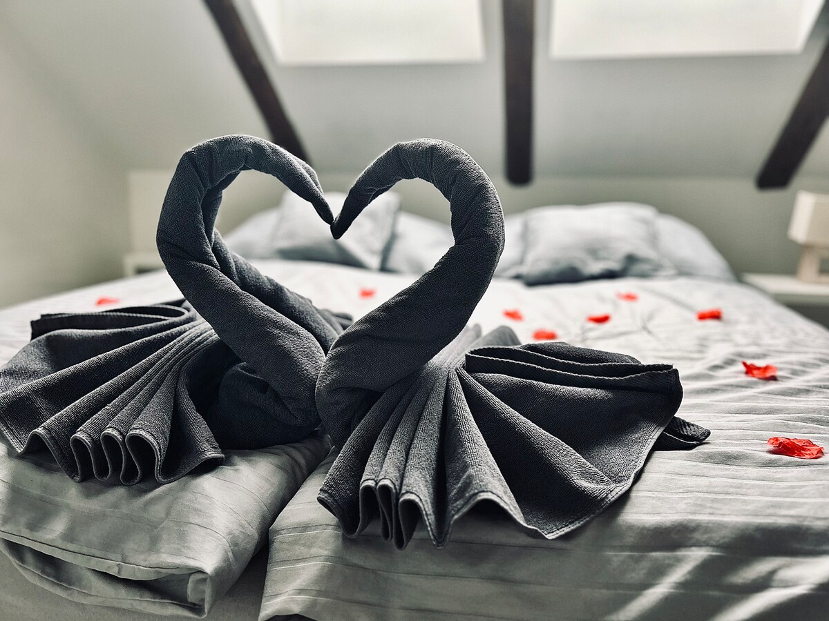 This 60m2 apartment was the first one we tuned up and it's our heartthrob that you will surely enjoy. A king bed in the bedroom, bunk beds and a large sofa bed will provide comfort for up to 5 people. It is equipped with just about everything so it will feel like home, The grill will delight with a cozy sitting area by the creek under the willow tree, which will provide privacy and shade on a summer day.