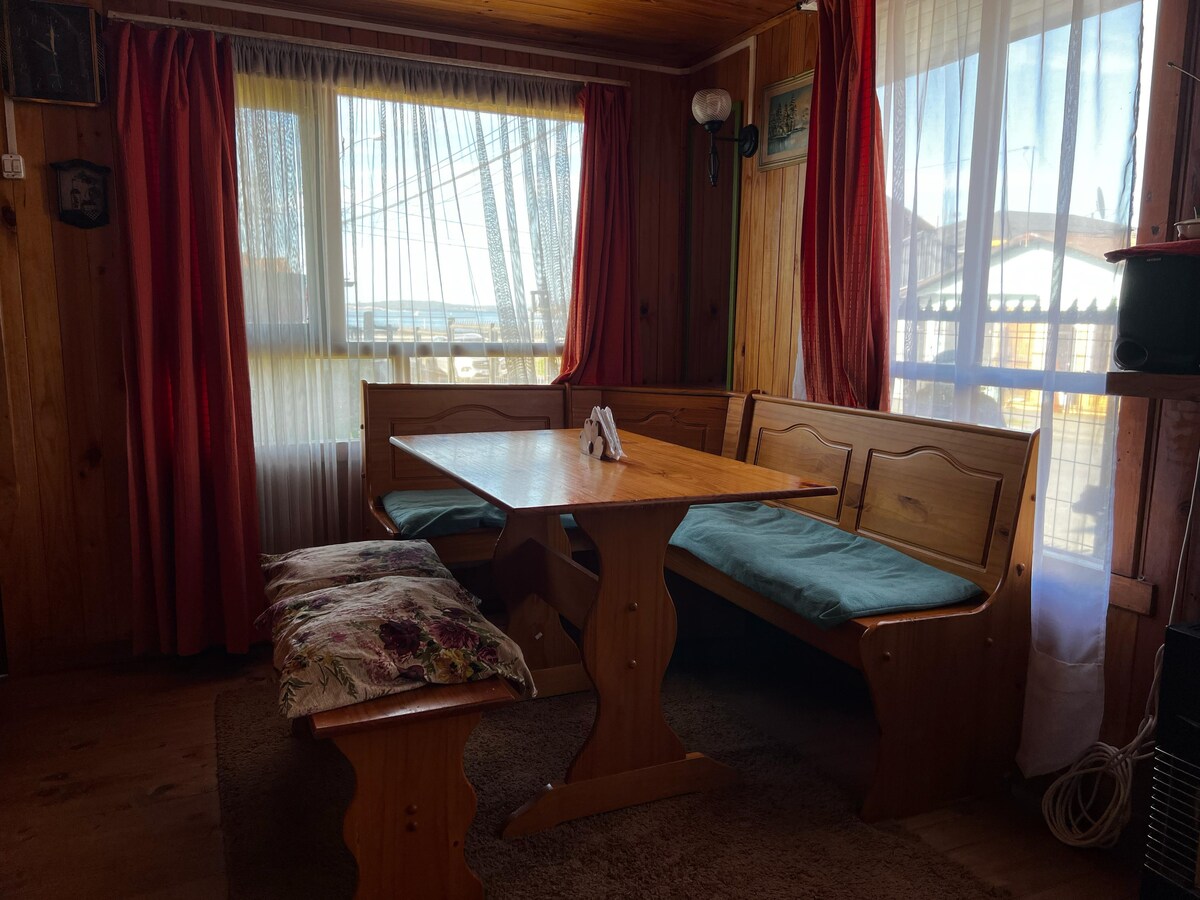 La lluvia afuera, el mar a sólo 10 pasos, los más bellos atardeceres de Chiloé, y esa mágica vista en todas y cada una de las ventanas de esta pequeña y acogedora casa, toda de madera, siempre calefaccionada con el fuego de la estufa. ¡Leña incluida! A pocos metros del muelle histórico y en pleno centro, cerca de los almacenes, restaurantes y terminal de buses. Precio promocional por alojamientos de una semana o más. Ven y vive Queilen, donde la tierra habla con el mar.
