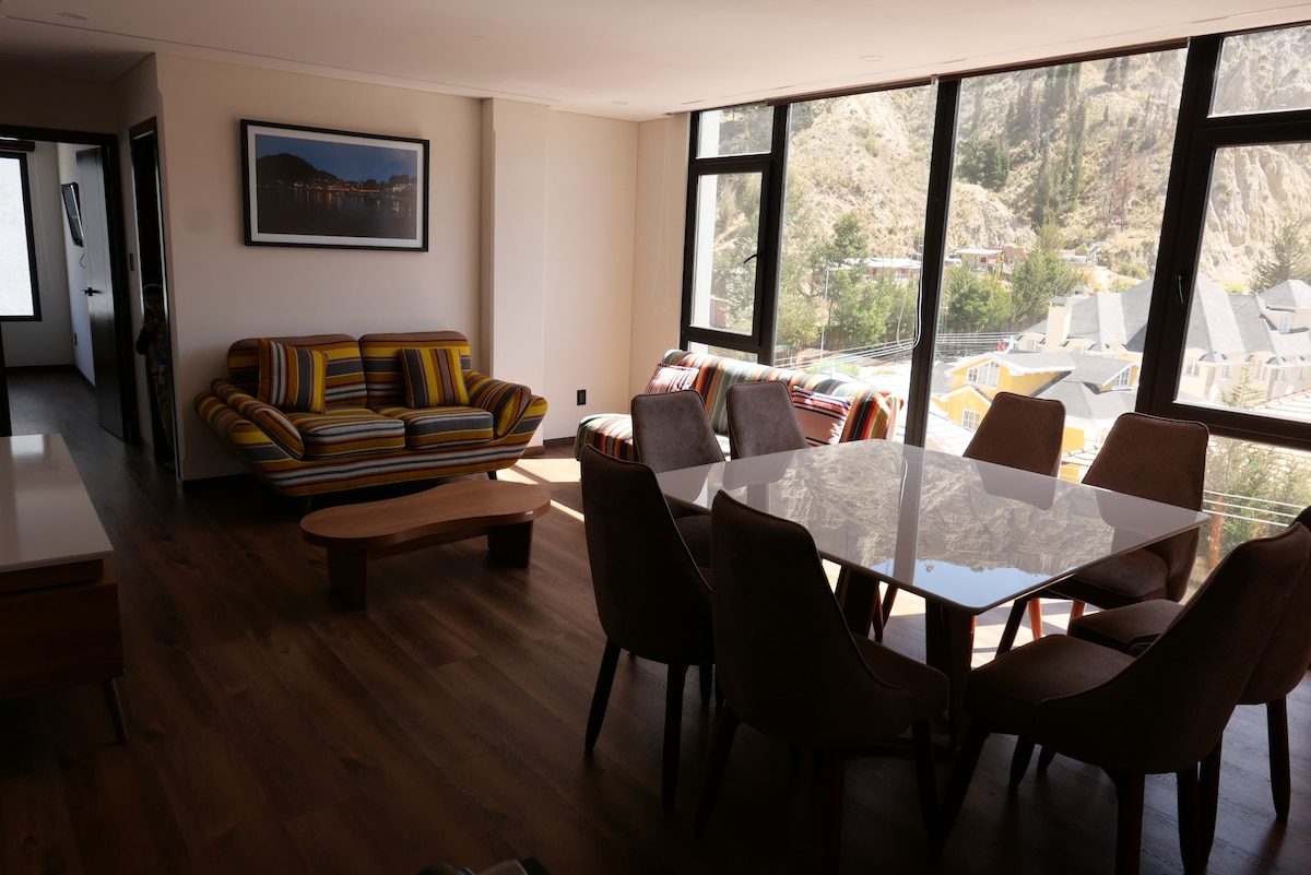 Discover La Paz from in this exclusive apartment in the best area. A modern, minimalist, and cozy space for those seeking comfort and style. Wake up to an impressive view and dive into the vibrant energy of this metropolis. Fully equipped for a perfect stay, it blends luxury and warmth. Ask about our premium airport transport service and experience La Paz with comfort and sophistication.