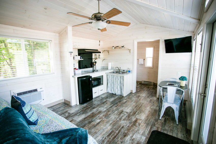 Kabin mewah gaya keluarga 2 bilik tidur tepi pantai dengan bilik tidur bersaiz queen persendirian dan bilik tidur dua tingkat. Kabin ini juga mempunyai tab mandi. Kabin rumah kecil ini mempunyai katil busa memori saiz queen di bilik tidur persendirian. Katil dua tingkat adalah saiz kembar. Ruang tamu ada sofa rumah kecil. Loteng "gaya kubu" berkarpet ini mempunyai tilam lantai bersaiz berkembar untuk kanak-kanak. Terdapat dapur penuh, ruang makan yang menempatkan 4 orang, dan semua yang anda perlukan untuk menikmati kopi/teh pada waktu pagi. Terdapat bahagian atas dapur. (tiada ketuhar)