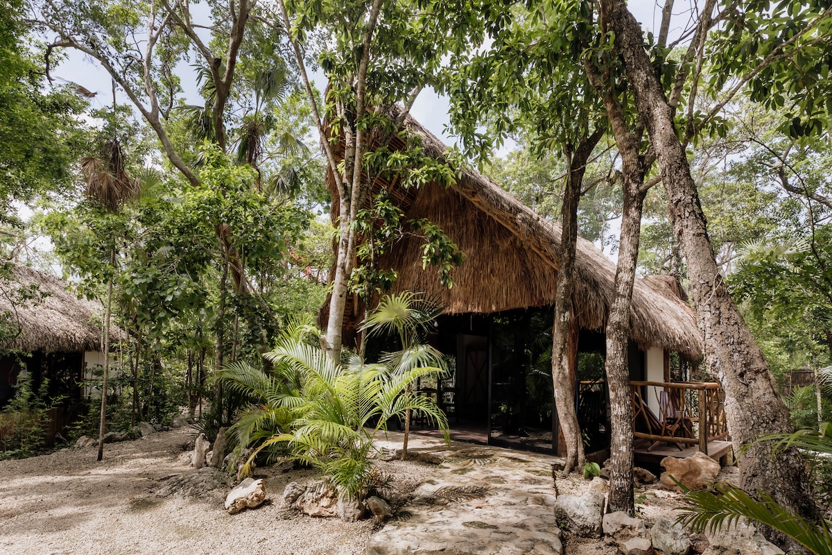 Bercuti ke kabin kami yang bergaya dan selesa di El Cuyo, hanya beberapa minit berjalan kaki dari pantai. Berehat di katil saiz king yang sangat selesa, berehat di buaian di mezanin, dan nikmati memasak dengan selesa di dapur yang lengkap. Bilik mandi terletak di tingkat bawah. Langkah ke teres peribadi anda dan nikmati suasana semula jadi yang santai—sesuai untuk melambatkan diri, mengecas semula tenaga dan menikmati rentak pantai Yucatán yang santai