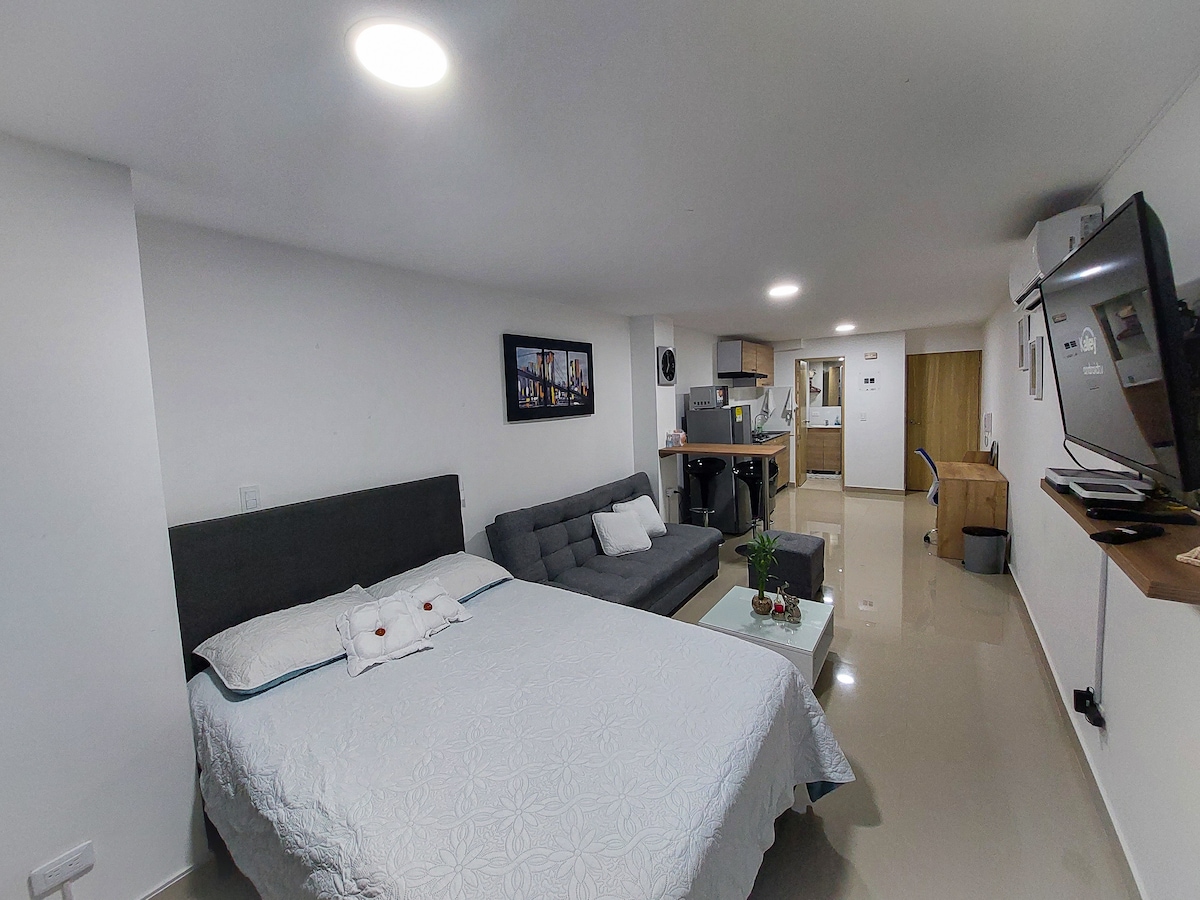Studio penthouse mewah di daerah Granada yang meriah di Cali dengan pemandangan bandar yang menakjubkan. Sesuai untuk pengembara solo, pasangan atau keluarga kecil. Boleh tidur sehingga 4 orang: katil queen dan sofa katil yang boleh ditukar menjadi katil queen yang selesa. Perhatian: **Jumlah kos tempahan berbeza-beza mengikut jumlah tetamu** Nikmati dapur penuh, dobi dalam unit, teres, serta akses ke kolam renang, gimnasium, spa, ruang kerja bersama dan bilik mesyuarat. RNT: 251456