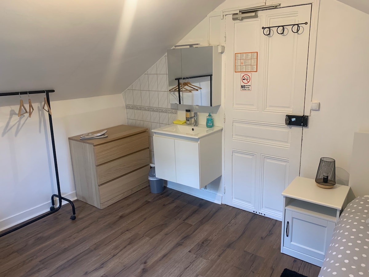 Bilik larangan merokok untuk 1 orang, dilengkapi dengan sinki dan katil 90x190. Ia terletak di tingkat bawah. Tandas (di tingkat 1) dan pancuran mandi (di tingkat 2), semasa mendarat, untuk dikongsi dengan 4 penyewa lain dari bilik lain. 50 meter dari stesen trem T2 "Les Milons" (Line La Défense - Porte de Versailles) Lantai kayu keras baru, cat semula, meja, kerusi, rak baru. Bilik ini telah diubah suai tetapi bukan kawasan umum, penuaan tetapi bersih. Hotel & Kejiranan Tenang