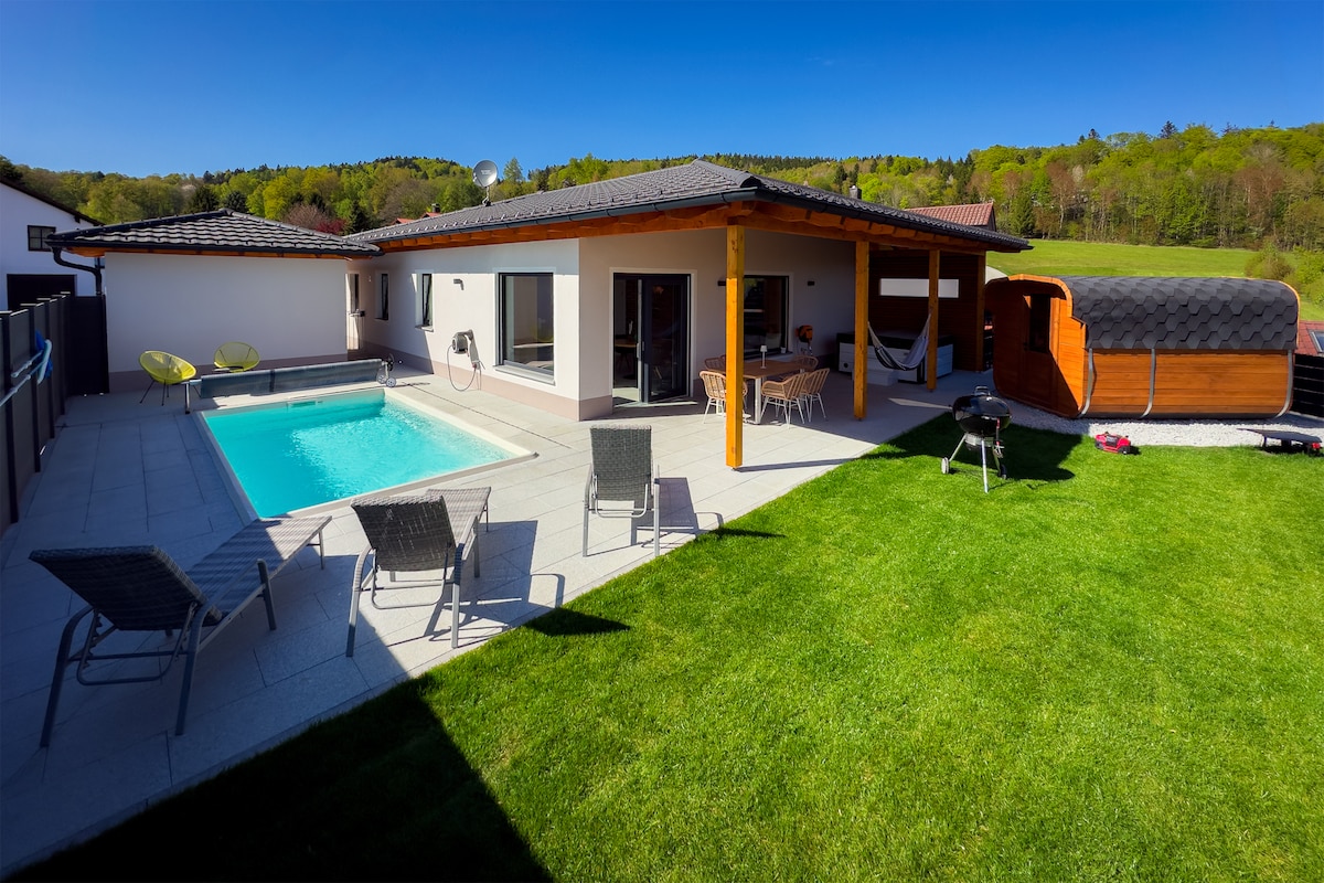 Banglo berperabot moden berkualiti tinggi, boleh diakses. Sesuai untuk pasangan atau keluarga, taman besar tanpa pagar, banyak alam semula jadi, ketenangan syurga, tasik dan gunung, tetapi juga banyak peluang untuk aktiviti dan lawatan. Banyak laluan mendaki & laluan basikal yang indah, restoran yang sangat baik (jarak kira-kira 800 m) dan stesen pengecasan untuk e-basikal di garaj. Rumah bertenaga rendah dengan solar di atas bumbung.