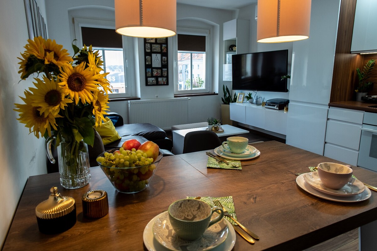 Mieszkanie w historycznej kamienicy z niepowtarzalnym klimatem i charakterystycznymi krzywymi schodami. Przytulne wnętrze tworzy domową atmosferę, gdzie każdy poczuje się jak u sobie w domu. Położone tuż przy deptaku, oferuje widok na sezonowy ogródek muzyczny i klub nocny X-Demon – świetne miejsce dla tych, którzy lubią tętniące życiem otoczenie. Doskonała baza na wyjątkowy pobyt w Zielonej Górze!