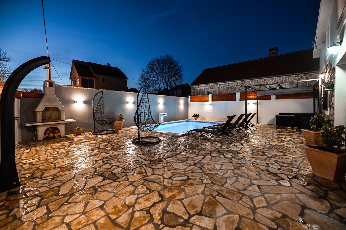Rumah batu mediteran yang tulen dengan kolam renang besar yang dipanaskan (30m2 dengan bangku jacuzzi) di kampung berhampiran Zadar. Jumlah keluasan tanah ialah 300m2 dengan tempat letak kereta persendirian, taman, kolam renang besar yang dipanaskan, 6 katil matahari kayu dan dua teres besar dengan lounge. Untuk keseronokan terdapat biliard, tenis meja,matlamat untuk fotball, picado. Rumah terletak di kampung kecil jauh dari kebisingan bandar. Ia mempunyai pemandangan terbuka yang indah tentang alam semula jadi dan mauntines. Anda boleh menikmati privasi sepenuhnya. Rumah dikelilingi oleh ladang dan anda boleh melihat haiwan domestik