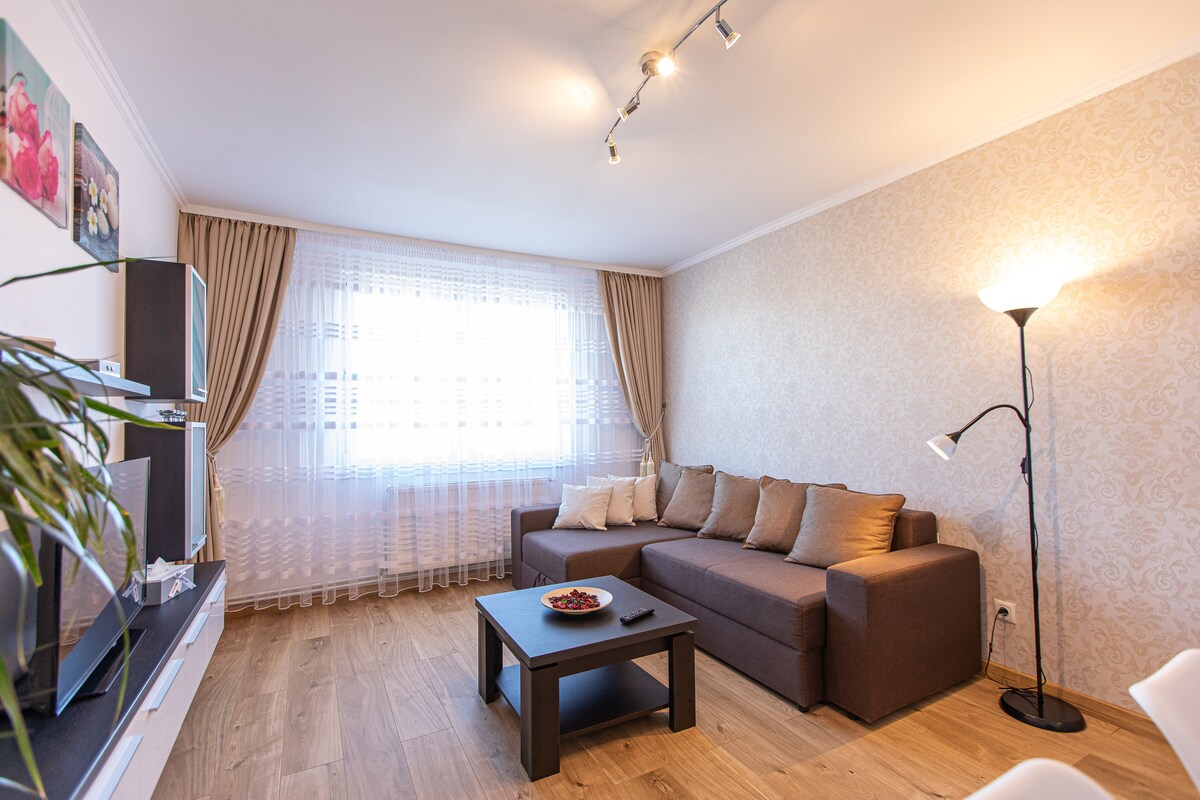 Terletak di pinggir pusat bandar Brasov yang sibuk dan meriah, Isolina Rooftop adalah apartmen satu bilik tidur baharu yang mewah dengan teres besar yang menawarkan pemandangan bandar dan gunung-ganang di sekitarnya yang menakjubkan. Kami mengesyorkan lokasi baharu kami untuk mereka yang mencari hujung minggu romantik, percutian selesa untuk dua orang, lokasi yang tenang dan indah yang anda sentiasa ingin lawati semula semasa berada di Brasov.